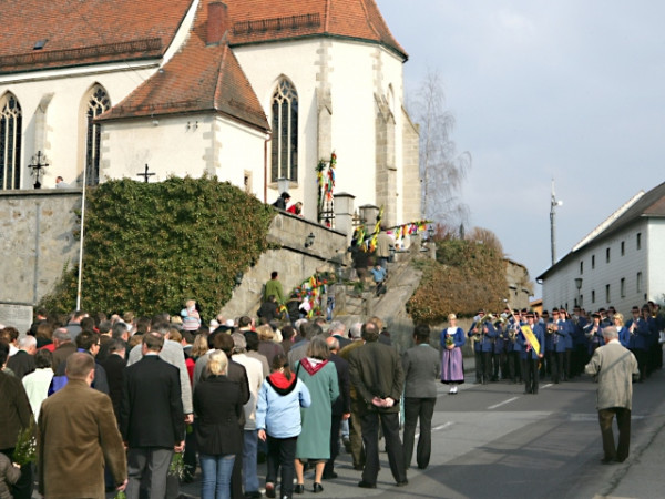 Der letzte Sonntag in der Fastenzeit, der Sonntag vor Ostern, ist der Palmsonntag. Dem Neuen Testament nach winkten die jubelnden Volksmengen Jesus Christus mit Palmwedeln und Ölzweigen zu, als er auf einem Esel reitend zum Passahfest in die Stadt Jerusalem einzog. Die katholische Kirche feiert diesen Tag mit Palmweihe und Palmprozession vor dem sonntäglichen Gottesdienst. Palmzweige gelten als Symbol für Leben, Auferstehung nach dem Tod und Sieg. Man trägt sie am Palmsonntag in den Prozessionen mit, um das biblische Geschehen bildlich darzustellen. In Ermangelung von richtigen Palmzweigen werden in unseren Breiten Palmbuschen mit Palmkätzchen zur Palmprozession mitgebracht. Palmbuschen - regional unterschiedlich auch als Palmbaum, Palmstange oder Palmbeserl bezeichnet - sind entweder als Strauß mit einem bunten Wollfaden zusammengeschnürte Zweige, oder aber kunstvoll an meterhohen Stangen fixierte Buschen. Sie sind in der Regel ein bis vier Meter hoch, es finden sich aber auch 10 Meter lange Exemplare, die ihren Erbauern im Wetteifern um den schönsten und größten Palmbuschen Ehre machen. In unseren Breiten werden üblicherweise sieben oder neun Kräuter zu einem Buschen gebunden. Auf diese ungerade, in Volksfrömmigkeit und Aberglauben verhaftete Zahl wird großer Wert gelegt, da der Palmbuschen nach der Weihe ja auch auf den Dachboden gegeben wird und dort der Abwehr von Unheil und Blitzschlag dient. Auf die Felder gesteckt soll der Palmbuschen für eine gute Ernte sorgen und im Herrgottswinkel aufbewahrt Glück und Segen für Haus, Hof und Bewohner bringen. Ein Palmbuschen im Stall schütze die Tiere vor möglichem Unheil und Krankheit, heißt es im Volksglauben. Dem Brauch nach soll man weder Draht noch Nägel einsetzen, sondern die Zweige und Dekorationen mit einem Rindenstreifen zusammenschnüren. Zum Binden der Palmbuschen werden grüne Zweige verwendet, je nach Region sieben bzw. neun verschiedene Arten: z.B. Birke, Buchsbaum, Eibe, Eiche, Erika, Haselnuss, Kirsche, Palmkätzchen (Weiden), Seidelbast, Stechpalme (Schrattl), Thuje (Segenbaum), Wacholder (Kranawitten) oder Zeder. Die Stangen können mit Papierstreifen umwunden und mit bunten Bändern geschmückt sein, deren Farben bestimmte Bedeutungen zugeschrieben werden (violett und schwarz für die Trauer, gelb und orange für die Freude). In vielen Gemeinden bindet man Palmrezeln oder Äpfel in die Palmbuschen. Süße Palmbrezeln sind im Gegensatz zu Fastenbrezen schon ein erster Vorgeschmack auf die österlichen Köstlichkeiten. Durch die Palmweihe gelten die Palmzweige als unheilabwehrende Segensbringer, man steckt sie nach dem Gottesdienst an besondere Plätze im Haus (Herrgottswinkel, Dachboden etc.), hinter den Rückspiegel im Auto oder setzt sie in den Garten bzw. auf das Feld. Selbst alt und getrocknet dienen sie noch dem Räuchern in den Raunächten oder sie werden als Asche für das Aschenkreuz am folgenden Aschermittwoch eingesetzt. Palmbuschen für den BergDie Ortsgruppe des Alpenvereins Neukirchen an der Vöckla trägt seit den 1970er-Jahren alljährlich nach der Palmweihe einen Palmbuschen zur Saisoneröffnung des 1572m hoch gelegenen Hochleckenhauses auf den Berg. Siehe auch: Gebildbrote, Karwoche Andere Bräuche in der Kategorie Fastenzeit: