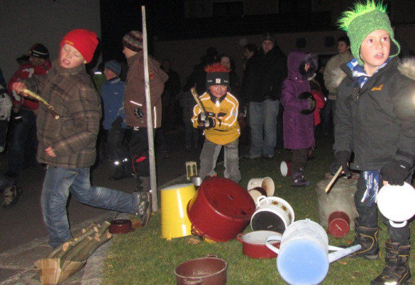Mit alten Kannen und Kochtöpfen ziehen Kinder beim "Wolfablassen" lärmend durch Klaffer am Hochficht Foto/Kulturgemeinschaft Klaffer |