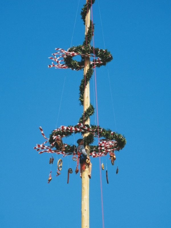 Maibaumbehandelt auch die Begriffe: Maibaum-Kraxeln, Maibaumstehlen |
