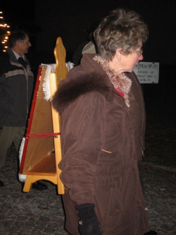 Marienbild in der Pfarre St. Paul zu Pichling Foto/Fritz Hagendorf Frauentragen in der Pfarre St. Paul zu Pichling. Das Marienbild wird auf einer "Kraxe" zur nächsten Familie getragen. Foto/Fritz Hagendorf Frauentragen in Pichling. Bei der Feier in der Herbergsfamilie. Foto/Fritz Hagendorf Am Heimweg mit dem Marienbild auf der Kraxe. Pfarre St. Paul in Pichling. Foto/Fritz Hagendorf |
